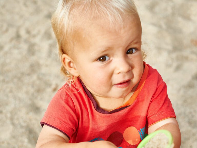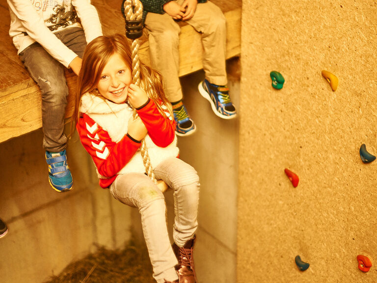 An der Kletterwand und dem Kletterseil in der Spelscheune testen die Kleinen ihr Können. Netzschaukel, Sandkasten und Babyschaukel bereiten auch den kleinsten Gästen Spaß.